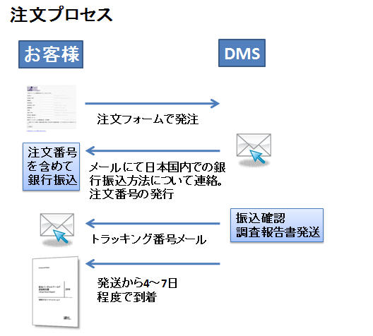 調査報告書はアメリカ西海岸シアトルで作成されておりますので、下記のようなプロセスでご注文を受けさせていただきます。振込確認、発送などに多少時間がかかりますがご理解いただければと思います。